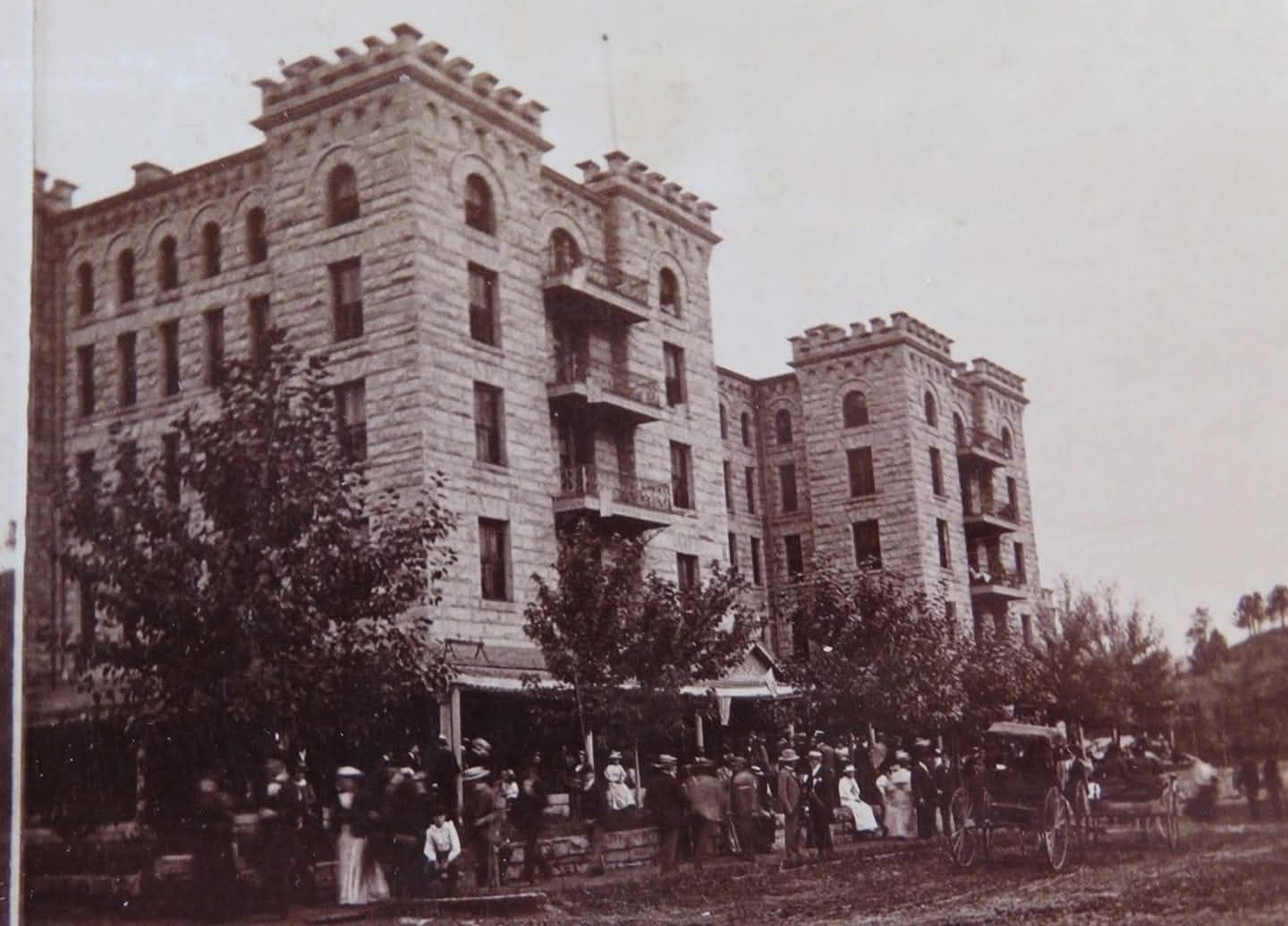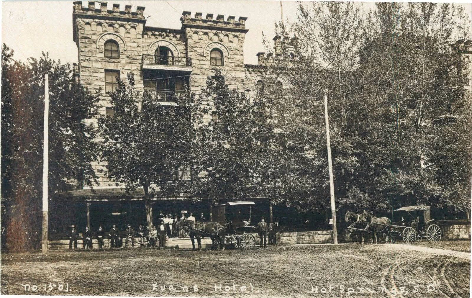 After the wooden Minnekahta Hotel burned, Fred T. Evans began work on a new stone hotel on the same site. During construction in 1891 and early 1892, newspapers still referred to it as the Minnekahta Hotel. By midsummer, however, the name had shifted to the Evans Hotel in recognition of its patron, and the grand opening was announced for August 5, 1892.