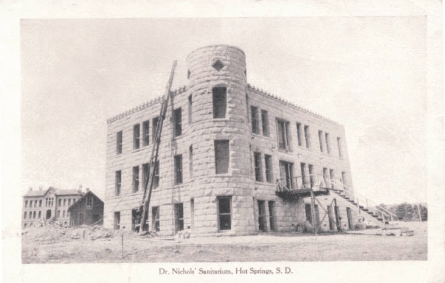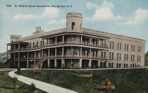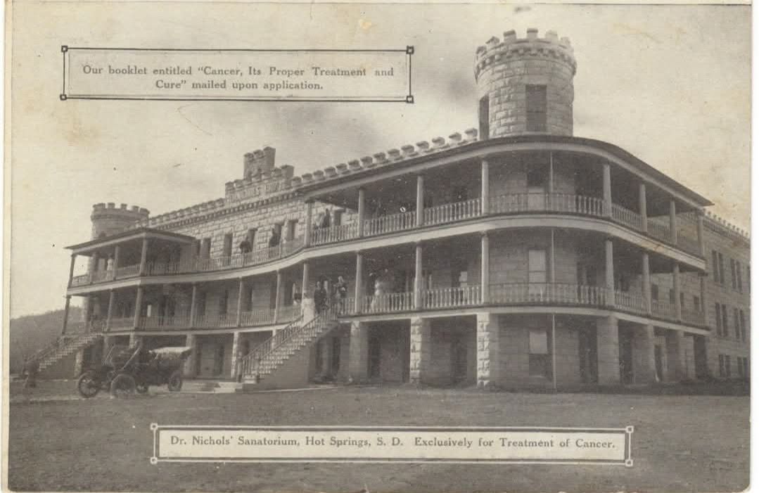 Perched on a sandstone hilltop northeast of downtown, Nichols’ Sanitorium was built around 1907 by Dr. Perry Nichols as a private cancer treatment facility. Its imposing Romanesque Revival form—with round towers, crenellated battlements, and smooth local sandstone—earned it the nickname “the Castle.” Nichols treated patients with the controversial escharotic method of zinc and arsenic pastes, a practice that drew national attention before being discredited in 1933.